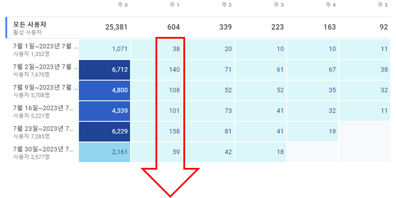 세로 방향은 각 기간에 해당하는 코호트(동질 집단)에 대한 재방문 기준을 충족한 집단을 알 수 있으며, 기간에 따른 재방문 수를 파악 및 비교할 수 있습니다.