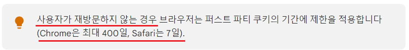 각 브라우저의 공급사의 정책에 따르면 재방문하지 않을 경우 퍼스트 파티 쿠키의 기간을 구글 사의 크롬 브라우저는 최대 400일, 애플 사의 사파리 브라우저는 최대 7일 까지로 제한을 두고 있습니다.