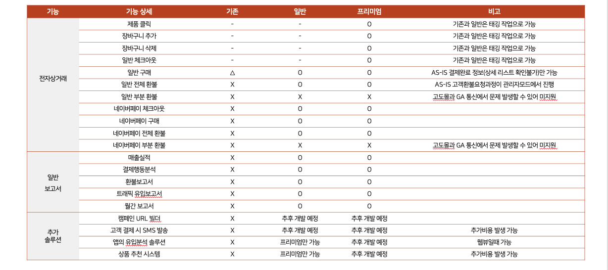 이후 월간 보고서를 통해 쇼핑몰의 추이 및 결과를 확인하실 수 있도록 합니다. 다만 전자상거래 구축의 경우 기본 솔루션과 프리미엄 솔루션 두가지로 나뉩니다. 기본 솔루션의 경우 간편결제 데이터 수집 태깅만을 도와드리며, 프리미엄 솔루션은 페이지별 전자 상거래 태깅과 목표 설정까지 작업을 진행해 드립니다.