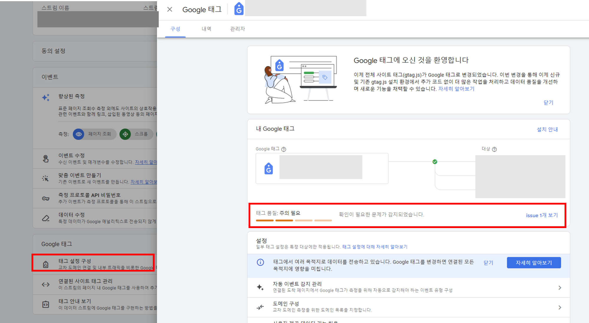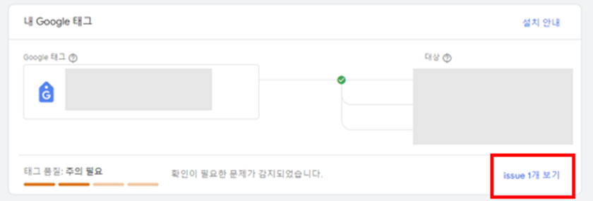 태그 품질 상태에 따라 진단이 필요한 경우, [issuse 보기] 를 클릭 후 태그 진단에서 자세한 내용을 볼 수 있습니다.